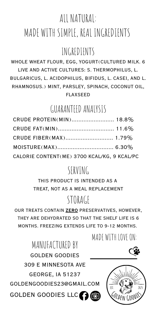 These crunchy biscuits are packed with good-for-them ingredients like mint, parsley, yogurt, spinach, and flax seed—plus no preservatives or fillers. Each 3oz bag has about 30–35 small-to-medium treats.