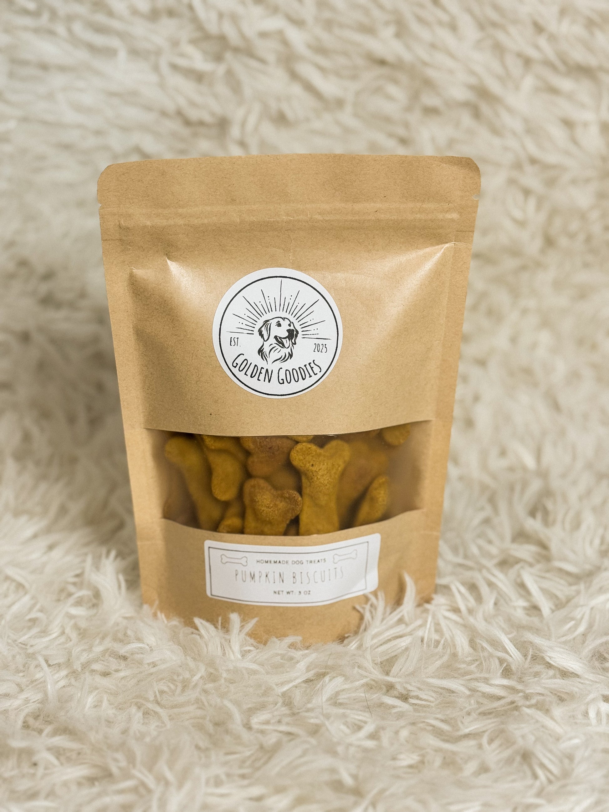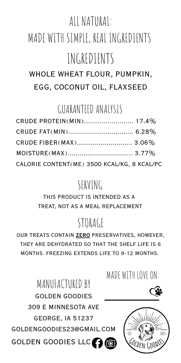 Made with simple ingredients like pumpkin, whole wheat flour, egg, coconut oil, and flax seed—these treats are easy on the tummy and full of healthy benefits. No preservatives, just 30–35 small-to-medium biscuits per 3oz bag.